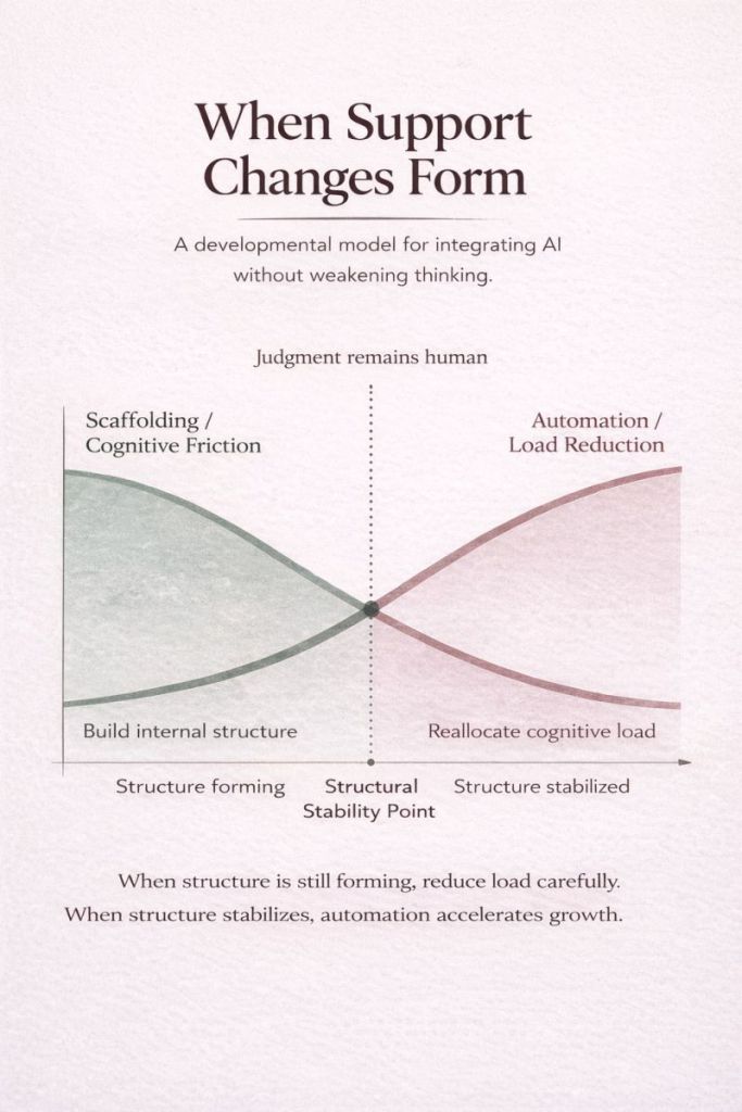 The distinction isn’t about whether AI is present. It’s about what kind of thinking the environment is requiring at a given stage. When automation replaces the very decisions that build internal models, it weakens development. When it supports decisions that are already grounded in understanding, it can amplify capability.