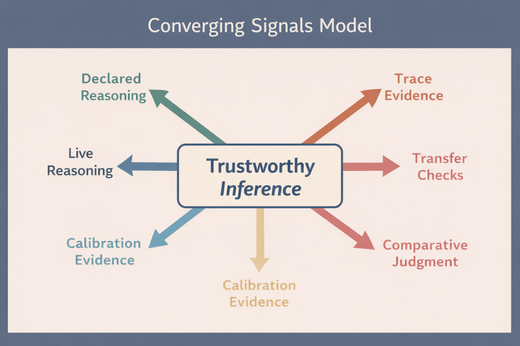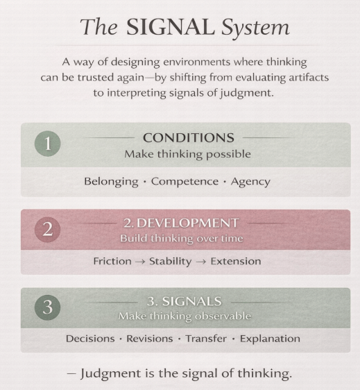 Instead of interpreting thinking from a single product, we must begin interpreting signals—patterns of reasoning that emerge across time, context, and constraint. Thinking is no longer inferred from what is produced once, but is inferred from how judgment holds across: