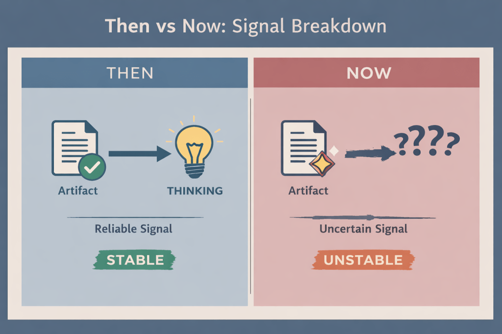 That assumption depends on a stable relationship between performance and cognition. When that relationship weakens, no amount of refinement to the artifact can fully restore it.