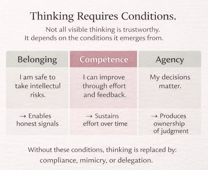 The conditions shape whether thinking is expressed honestly. Development shapes whether that thinking is actually formed. Signals shape whether we can see it at all. When any one of these breaks down, the others become harder to interpret.