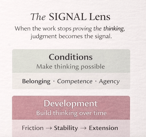 Earlier frameworks helped us make thinking visible. The SIGNAL Lens responds to a new condition—where visible products no longer reliably represent thinking—and focuses on designing for trustworthy signals of judgment across time and context.