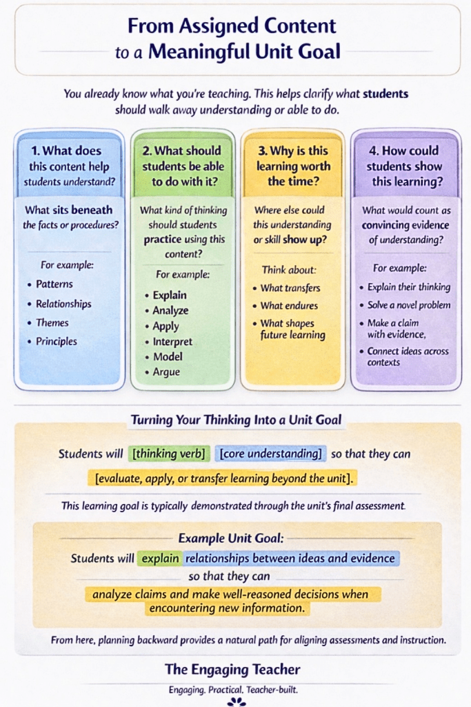 When the unit goal is clear first, lesson planning becomes more intentional and assessment naturally reflects learning rather than coverage.