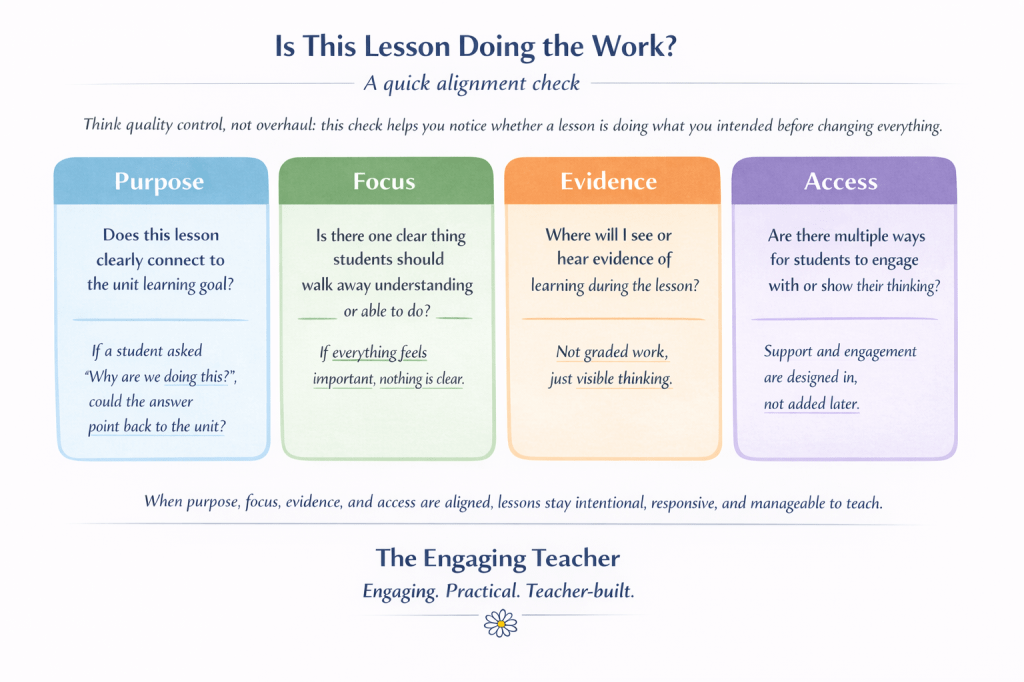 This graphic gives you a quick, teacher-friendly way to check whether a lesson really supports your unit goals, stays focused on one clear idea, and invites meaningful thinking. Instead of guessing whether students are learning what you planned, this alignment check helps you notice learning as it happens without adding another planning task.