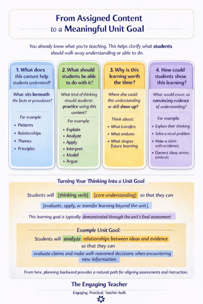 When the unit goal is clear first, lesson planning becomes more intentional and assessment naturally reflects learning rather than coverage.